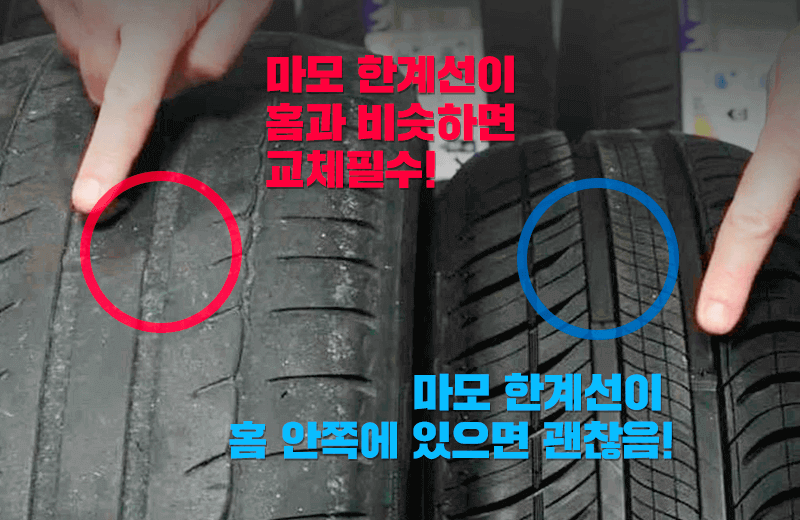 - 마모 한계선이 트레드와 같은 높이라면 즉시 교체