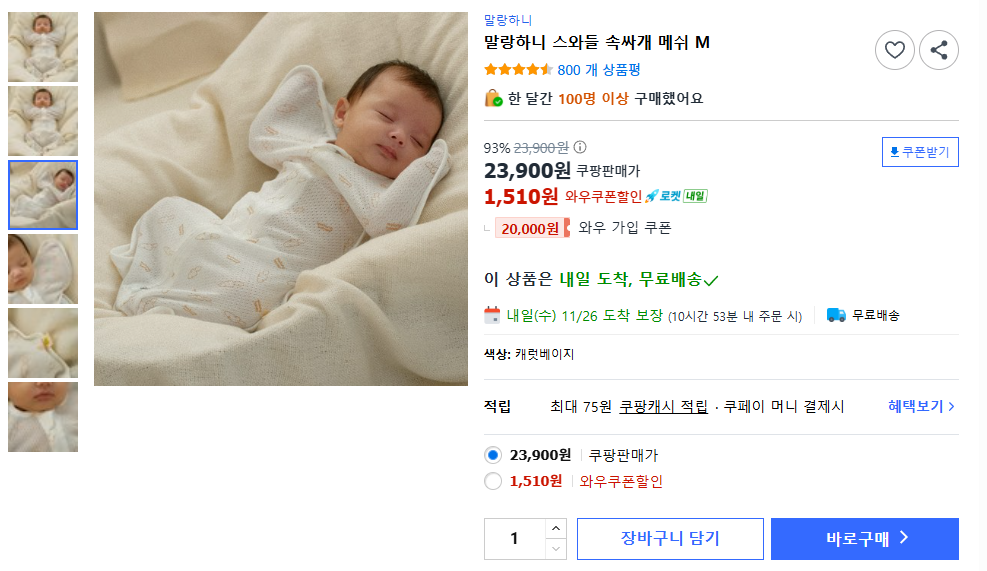 아기의 성장과 함께 속싸개에서 슬리핑백이나 겉싸개로 자연스럽게 넘어가는 것이 일반적이므로, 이 제품으로 신생아 초기 안정감을 제공하고 이후 단계에 맞춰 확장해 나가는 전략도 추천드립니다. 속싸개 선택에 고민 중이라면 이 제품을 충분히 고려해보시길 바랍니다.