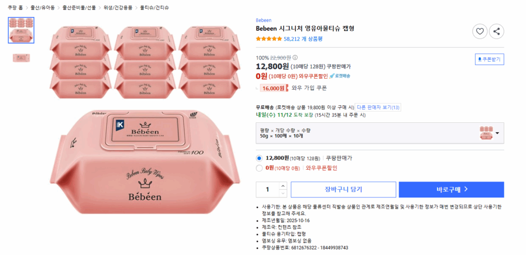 | Bebeen 시그니처 영유아물티슈 캡형 | 약 88원 | 없음 | 순한 사용감, 가성비 우수 |
